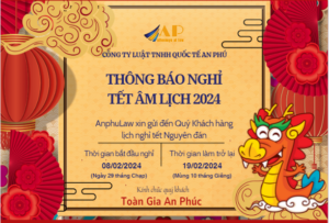 THÔNG BÁO NGHỈ LỄ QUỐC KHÁNH 02/9/2023 Kính gửi Quý Khách hàng, Quý Đối tác, Công ty Luật TNHH Quốc tế An Phú xin trân trọng thông báo tới Quý Khách hàng, Quý Đối tác lịch nghỉ lễ Quốc khánh 02/09/2023 cụ thể như sau: Ngày nghỉ: Thứ Sáu ngày 01/09/2023 và thứ Hai ngày 04/09/2023 Ngày làm việc trở lại: Thứ Ba ngày 05/09/2023. AnPhu Law chân ...